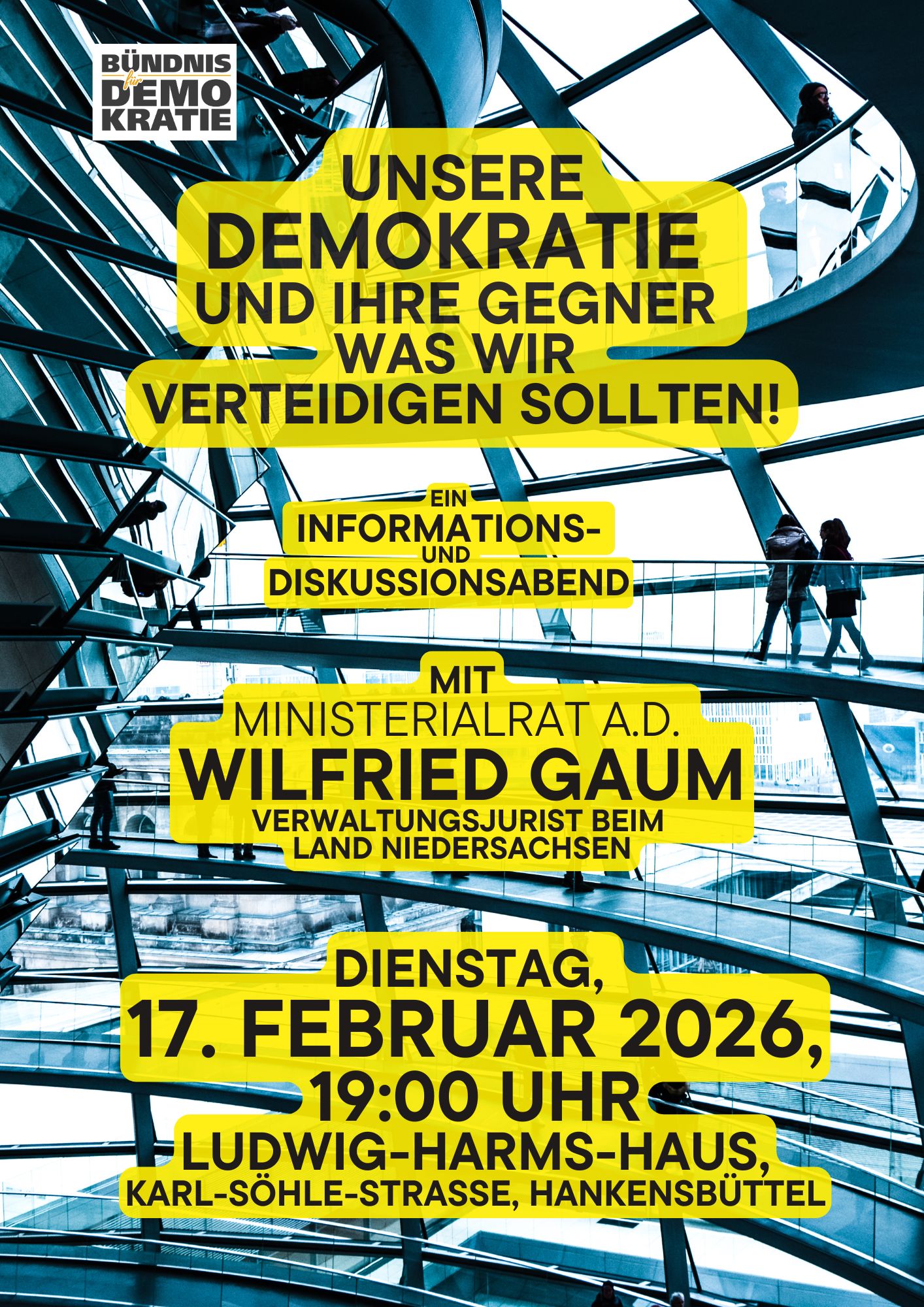 Das Bündnis für Demokratie lädt zu einem Informations- und Diskussionsabend unter dem Titel „Unsere Demokratie und Ihre Gegener – was für verteidigen sollten!“ ein. Als Referent wird Ministerialrat a. D. Wilfried Gaum, Verwaltungsjurist beim Land Niedersachsen, in das Thema einführen und zentrale Herausforderungen für unsere demokratische Ordnung beleuchten. Im Anschluss besteht Gelegenheit zur gemeinsamen Diskussion. Die Veranstaltung findet am Dienstag, 17. Februar 2026, um 19:00 Uhr im Ludwig-Harms-Haus, Karl-Söhle-Straße, Hankensbüttel, statt.